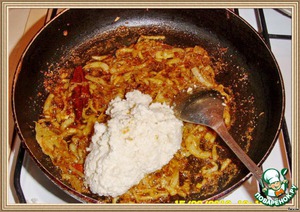 Взбить венчиком йогурт и маленькими порциями добавлять в соус, постоянно размешивая. Тушить на среднем огне.