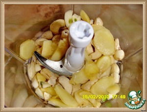 В блендере или процессоре смешать имбирь, чеснок (мелко нарезать), воду и орехи