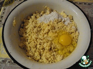 Добавить соду, крахмал, соль и яйцо, перемешать.