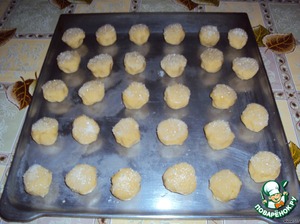 Затем макать кусочки теста в сахар и выкладывать на смазанный противень.