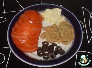 Помидор нарезать кружочками, шампиньоны и чеснок - тонкими ломтиками, маслины - колечками.