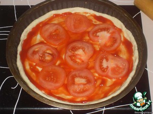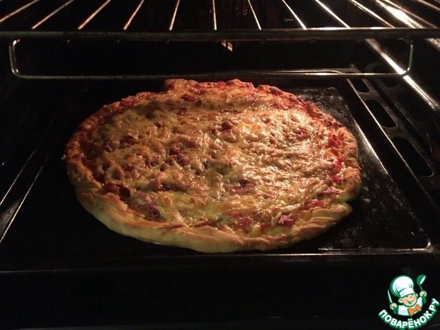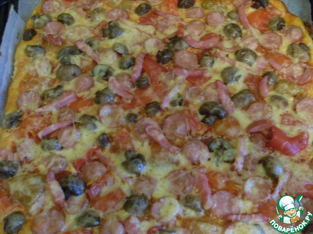 Пицца "В день рождения сына". У сына внезапно приключился день рождения. Нет, я, конечно, помню, когда он родился, но праздновать он не собирался, а тут приходит и спрашивает: "Мама, можно ко мне зайдут друзья? Мы посидим, пива попьем". Говорю: "Так ведь нет ничего!" "А ничего и не надо!" - отвечает. Ну, как же! 8 молодых, здоровых парней с пивом и закусить нечем... Надо срочно что-то придумать! Ну, конечно! Надо испечь пиццу! Даже 2 пиццы! Чтобы всем хватило! Бегом на кухню...