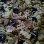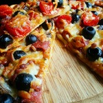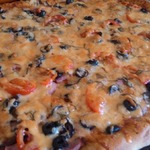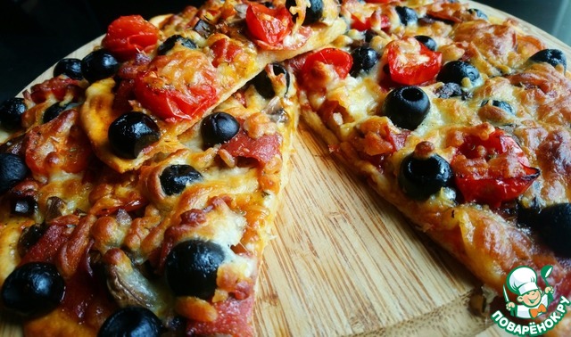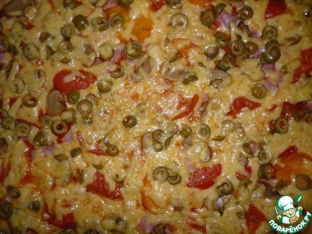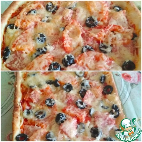 Засыпать пиццу тертым сыром. Тут уж по вкусу, может быть у вас уйдет и больше 100 г. Сверху разложить колечки маслин. Поставить пиццу в горячую духовку. Выпекать около 25 минут. Как только края и сыр зарумянятся, можно пиццу вынимать. Выложить пиццу на решетку и накрыть салфеткой минут на 10, чтобы она слегка остыла. Иначе, можно обжечься, пицца получается очень сочная.