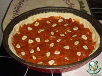 Тесто выложить в форму и размять руками, оформив бортик. Выложить зажарку и разровнять. Сверху разложить пластинки чеснока. |
