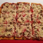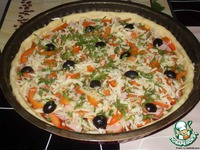Засыпать пиццу тертым сыром и разложить половинки маслин, посыпать зеленью. Отправить в горячую духовку. Выпекать при 200°С в течение 25-30 минут. |