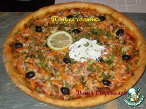 Готовую пиццу украсить сметаной и ломтиком лимона. В конце концов, это ведь солянка!!!