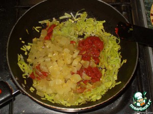 Добавить томат-пасту и огурец, потушить 5 минут. Добавить 1 ст. л. острого кетчупа и перемешать. |