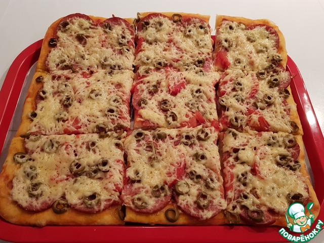 Готовую пиццу украсить сметаной и ломтиком лимона. В конце концов, это ведь солянка!!! Приятного аппетита! |