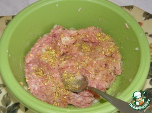 Добавляем в фарш чеснок, лук, смоченную в молоке булочку, специи и яйцо. Всё это тщательно перемешиваем!