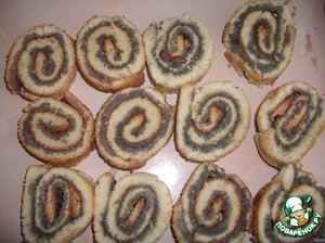 Пропитайте каждый корж 0,5 стак. сиропа, сверните рулетом и остудите. Затем нарежьте на кусочки толщиной 2 см. У меня из одного коржа получается 12 рулетиков.