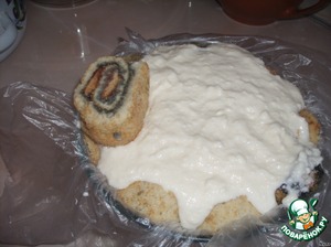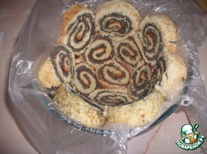 Застелите форму пищевой пленкой (у меня обычный салатник, в котором я делала тесто) и выложите рулетиками дно формы и её края до верха. Несколько рулетиков должно остаться, они нам ещё пригодятся.
