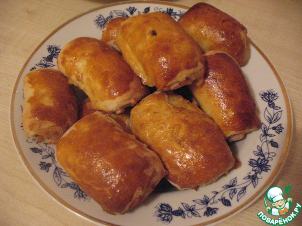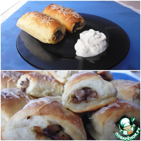 Потом опять на край пласта выкладываем грибочки и заворачиваем в рулетик. И так, пока не закончится тесто. -