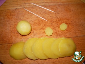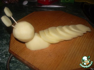 Картофель очищаем, отвариваем до полуготовности. Сливаем воду и подсушиваем. Картофелину побольше режем на кружочки. На фото показаны запчасти для одной улитки (тело, готова и рожки).