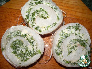 У меня получились очень широкие рулеты и я каждый разрезала на 3 части. И для надежности перевязала ниткой.