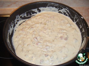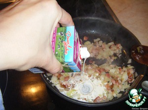 Влить сливки. Помешивая варить 2 минуты до загустения на маленьком огне.
