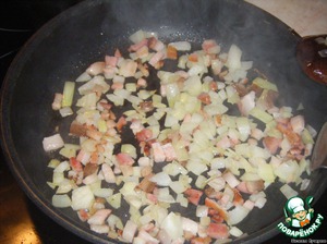Порезать грудинку кубиками. Обжарить на сковородке. Добавить лук и тоже обжарить вместе с грудинкой. Масло не нужно, т.к. жира от грудинки достаточно.