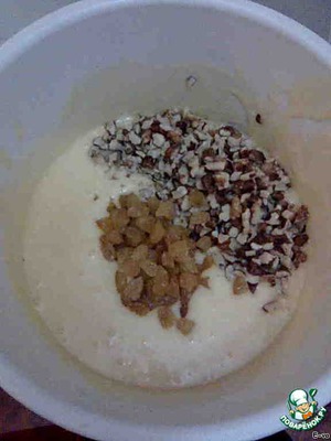Засыпаем цедру, изюм и орехи, всё хорошо перемешиваем.