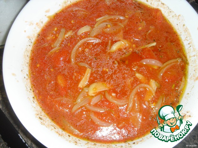 Обжарить лук с чесноком, выложить в глубокую тарелку. Добавить помидоры, специи. -