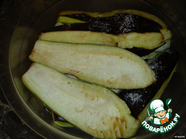 Баклажаны вымыть, срезать ножку, разрезать вдоль на 4-5 частей. Посолить и оставить на час.