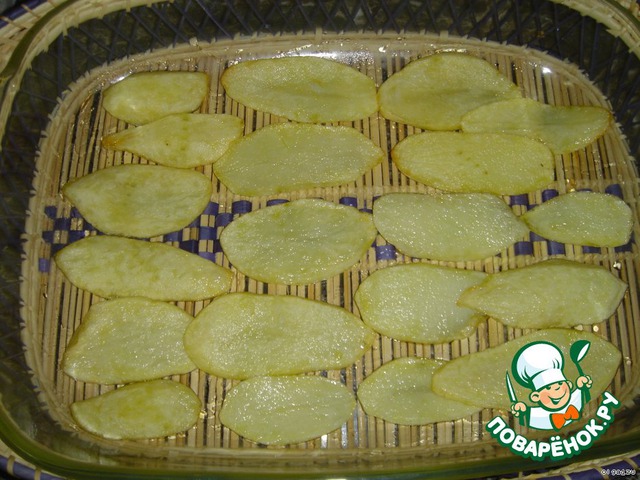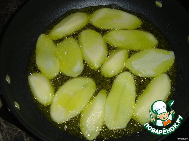 Очистить картофель, нарезать вдоль и обжарить до полуготовности с двух сторон.