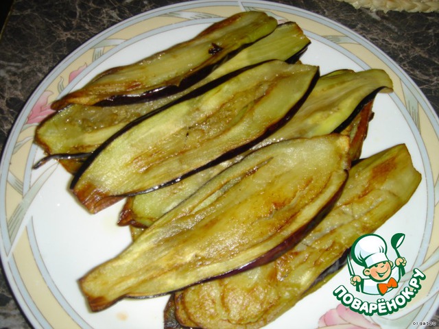 Баклажаны отжать и обжарить. И каждый разрезать вдоль.