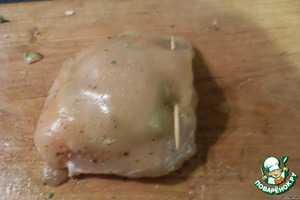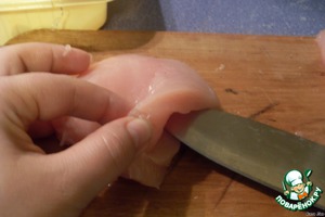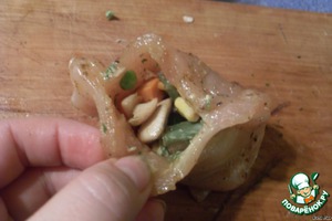 Широким ножом делаем надрез внутри, но не прорезаем до конца. Получается карман. Слегка отбиваем (я бы даже сказала приминаем), чтобы не разорвать стенки. Натираем солью и специями сверху и внутри. Отставляем в сторону.