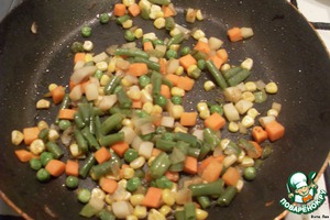Овощи, не размораживая, кладем на разогретую сковороду, добавляем чуть растительного масла, солим и обжариваем. Смешиваем грибы и овощи.