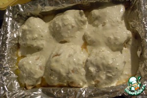 Как раз прошли наши 5 минут достаем противень и поливаем карманы заправкой. Ставим в духовку еще минут на 20 примерно, смотрите по своей духовке, как заправка на кармашках зарумянится - все готово.