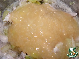 Все обжариваем до мягкости, добавляем бульон и яблочный соус, хорошо перемешиваем - это соус для мяса. -