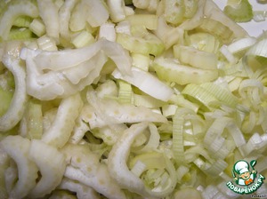 Пока жарится мясо, режем овощи: порей-полукольцами, сельдерей-соломкой, имбирь мелко рубим.