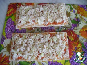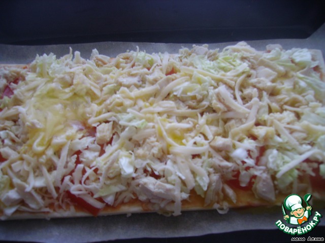 Далее выложить мелко нарезанную пекинскую капусту и нарезанное куриное филе (отваренное)