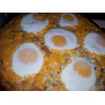 Сверху посыпать тертым сыром и залить все это хорошо перемешанными яйцами