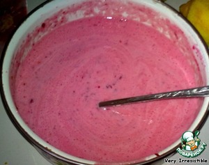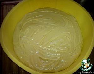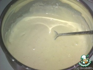 Я сделала половину порции. То есть сначала смешала 50 мл растительного масла, 100 мл йогурта и 75 гр сахара (это 3 ст.л.) до однородной пенистой массы, затем добавила 150 гр муки, смешанной с 1,5 ч.л. разрыхлителя, 100 мл молока и перемешала ложкой в течение минуты.