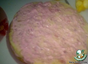 Сверху кладем белый корж (йогуртовый), его пропитываем меньше, так как он более влажный, и немного смазываем клюквенным кремом.