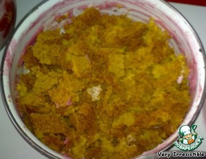 Один из медовых коржей (который похуже, я один все-таки умудрилась немного пересушить) разламываем на небольшие кусочки и перемешиваем с оставшимся клюквенно-сливочным кремом. Полученную смесь выкладываем следующим слоем.