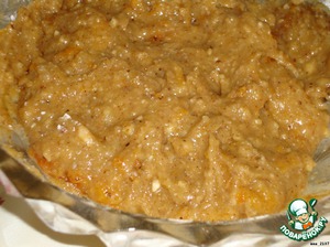 Измельчить орехи в кофемолке, смешать их с медом, абрикосовым вареньем и корицей. Добавить крахмал.