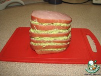 Сверху снова положить ломтик ветчины и опять слой сырной массы и т.д. Последней должна быть ветчина. Получается вот такой многослойный "гамбургер". |