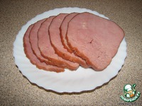 Ветчину (желательно взять кусок правильной формы - овальной, круглой, квадратной или прямоугольной, вобщем, с ровными краями) нарезать ломтиками толщиной 3-5 мм. |