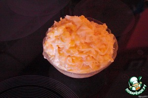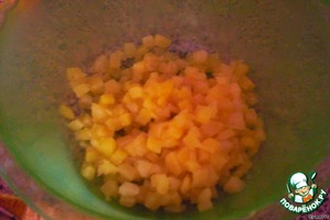 Все это перемешиваете минутки 2-3 прогреваете, остужаете и заливаете смесь из курицы и ананасов.