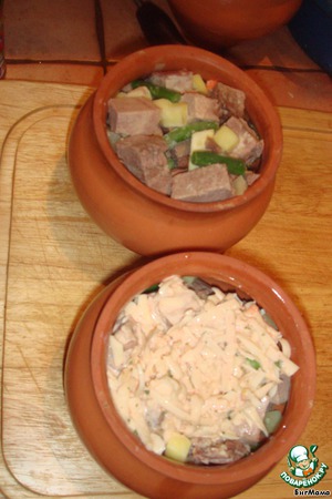 5. Раскладываем по разным горшкам отдельно язык с овощами и отдельно мидии. Заливаем равномерно сырной смесью.