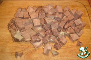 • 3. Отварной язык режем крупными кубиками и перемешиваем с овощами.