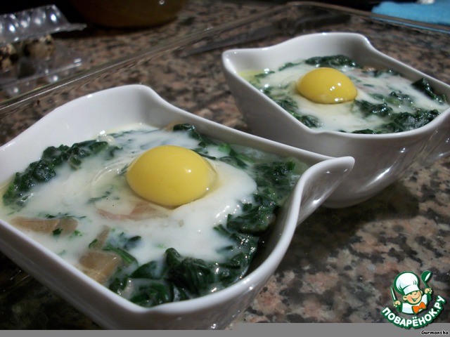 • Разложите по кокотницам и разбейте сверху перепелиное яйцо. Аккуратно его подпилите ножом, так как они обычно не разбиваются так, как куриные.