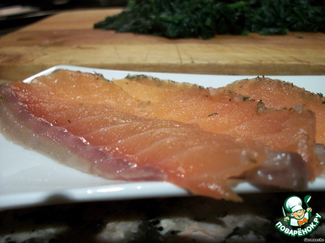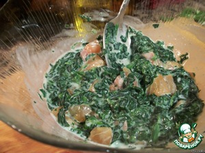 • Слейте воду и отожмите как следует шпинат. Порежьте и отложите. Порежьте также на кусочки средней величины лосось. Я солила сама, но можно и готовый.
