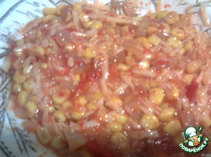 • Немного остужаем смесь, добавляем туда кукурузу, кетчуп, сыр, чеснок и соль. Хорошо перемешиваем.