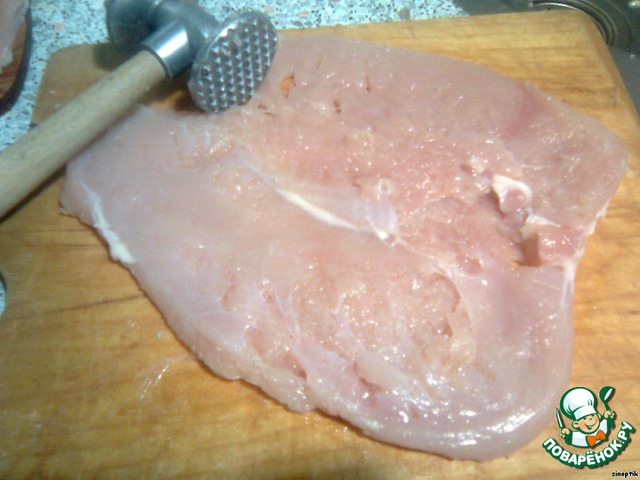 • Хорошенько отбиваем, чтоб получилось тоненько.