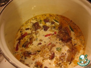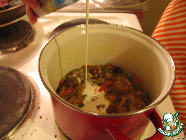 Переложить содержимое сковородки в кастрюльку, залить сливками.