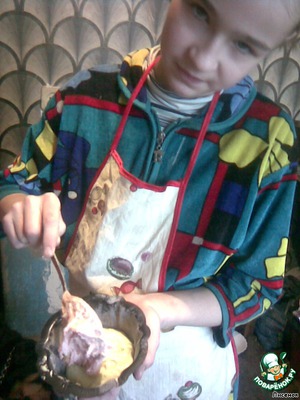 Решили мы с девчонками моими поменяться местами. Я нашла рецепт кекса, а они с удовольствием его приготовили. Правда, на фото не видно красивый и яркий разрез кекса, но Вы уж извините... Фотик не соответствует... Да и детки сами фоткали. Но кексы получились вкусными и красивыми...