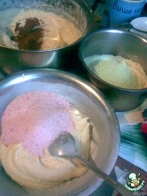 Готовое тесто разделить на три одинаковые части. В одну добавляем пудинг, в другую - желе, в третью - какао.