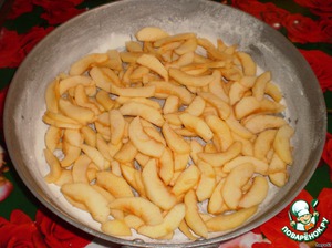 Приготовить форму, смазать растительным маслом и обсыпать мукой. Яблоки очистить от кожицы и порезать тонкими пластинками.