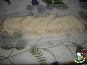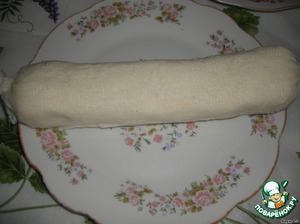 Большую полотняную салфетку (я взяла марлю и свернула её несколько раз) намочить в тёплой воде и отжать.выложить на неё творожную массу, придав ей цилиндрическую форму.